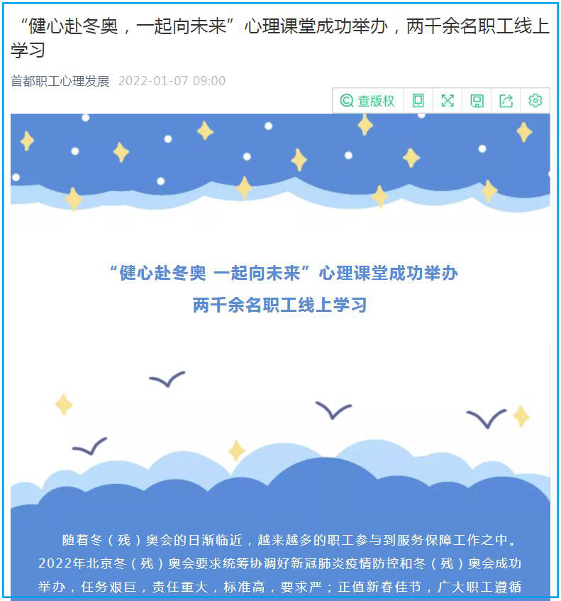 据北京市职工服务中心微信公众号“首都职工心理发展”消息,近日,“健心赴冬奥,一起向未来”职工心理关爱网络课堂首讲成功举办。来自首旅集团等单位的约2000名职工线上参与培训。本讲的主要内容是《服务冬奥,从心开始:工会干部和管理者如何做好职工的心理疏导》,培训取得了良好的效果,正如参训学员所说:听了老师的课,豁然开朗,突然有了“世界为你关上一扇门又打开一扇窗的感觉”。