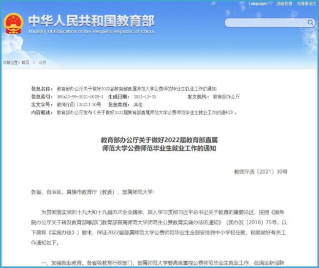 1月10日,教育部发布通知,要求做好2022届教育部直属师范大学公费师范毕业生就业工作。