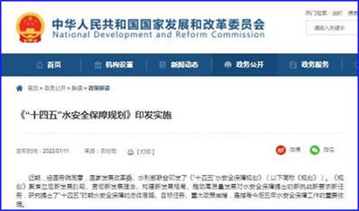 中工网讯 据国家发改委网站消息,近期,经国务院同意,国家发展改革委、水利部联合印发了《“十四五”水安全保障规划》(以下简称《规划》)。《规划》聚焦立足新发展阶段、贯彻新发展理念、构建新发展格局、推动高质量发展对水安全保障提出的新挑战新要求新任务,研究提出了“十四五”时期水安全保障的总体思路、目标任务、重大政策举措,是指导今后五年水安全保障工作的重要依据。