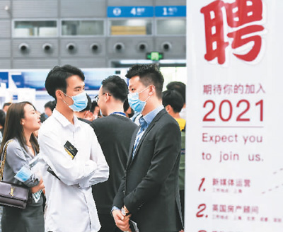 图为在中国国际人才交流大会设立的海归人才招聘会上,求职人员与企业招聘人员交流。新华社记者 毛思倩摄