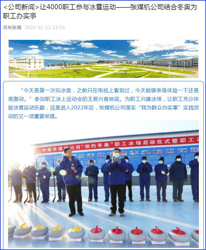张煤机公司工会主席万李表示,为修建职工冰场,在没有任何施工经验的情况下,公司上下齐心协力,广大职工和工会干部全力以赴,克服种种困难,短期内完成了基础工程、冰面铺设、安全装置、冰雪装备以及冰雪宣传等,更是让冰壶、冰球等冰雪项目“飞入寻常百姓家”,在全公司掀起了了解冰雪、参与冰雪、热爱冰雪的热潮。参加职工冰上运动会的王君称,第一次玩之前只在电视上看到过的冰壶,亲身体验后很激动。