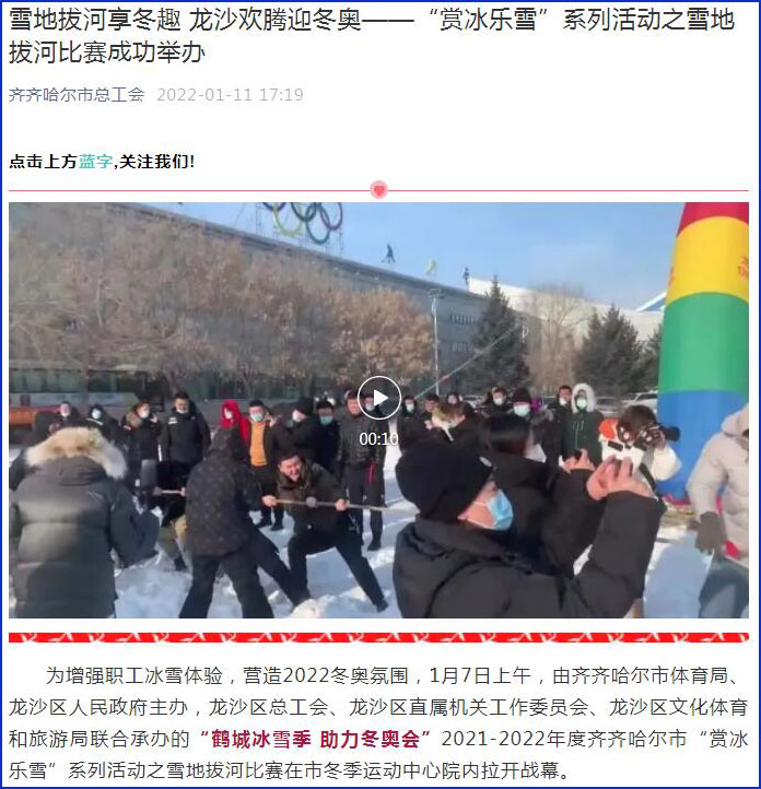 中工网讯 据“齐齐哈尔市总工会”微信公众号消息,为增强职工冰雪体验,营造2022冬奥氛围,近日,由齐齐哈尔市体育局、龙沙区人民政府主办,龙沙区总工会、龙沙区直属机关工作委员会、龙沙区文化体育和旅游局联合承办的“鹤城冰雪季 助力冬奥会”2021-2022年度齐齐哈尔市“赏冰乐雪”系列活动之雪地拔河比赛在市冬季运动中心院内拉开战幕。