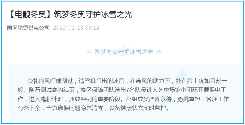 国网承德供电公司冬奥保障团队严格践行“四个办奥”理念,迎难而上,全力落实好周密保电方案,严格执行“1+3+N”保障体系,对重点环节、重要设备进行多轮次巡检,全面查缺补漏、消除隐患,着力解决电力专家重点关注的问题。全员以应急准备为重点,总结保电经验,不断强化突发事件处置能力,同时继续加强赛区设备监控力量,全面协调、各司其职,做到每个岗位信息畅通、行动迅速、协同联动,保障场馆服务优质高效,以最高标准、最严要求、最高质量打赢冬奥保电总决战。
