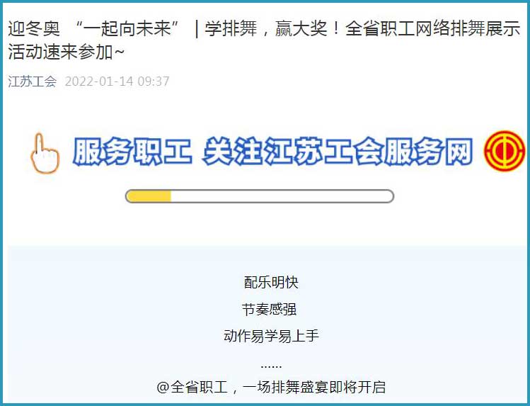 中工网讯 据江苏工会微信公众号消息,为庆祝冬奥会、冬残奥会在北京举办,鼓励江苏省职工参与全民健身,经研究决定,江苏工会在春节期间举办迎冬奥“一起向未来”全省职工网络排舞展示活动。全省各设区市和省产业(厅、局、企业)工会在职职工均可参加。
