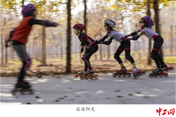 这两张照片,是河北辛集市526飞驰冰雪轮滑俱乐部少儿轮滑队的小队员们,在迎冬奥刻苦训练之余,利用休息时间做与轮滑有关的趣味游戏,表现出孩子们童真童趣的活泼可爱,参与体育运动、全民健身的美好画面。作者借助小树林边的斑驳光影,抓拍了孩子们活动的精彩瞬间。(摄影:李忠怀)
