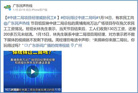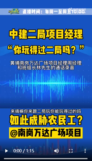 中工网讯 据@广东民声热线微博消息,1月14日,有农民工向@广东民声热线节目组反映中建二局总包的黄埔南岗万达广场项目存在拖欠农民工工资情况。