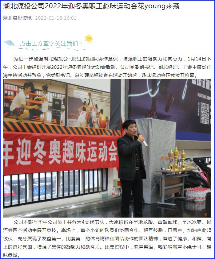 中工网讯 据“湖北煤投资讯”微信公众号消息,为进一步加强湖北煤投公司职工的团队协作意识,增强职工的凝聚力和向心力,近日,公司工会组织开展2022年迎冬奥趣味运动会活动。公司党委副书记、副总经理、工会主席彭正涛主持活动并致辞,党委副书记、总经理樊福锁宣布活动开始后,趣味运动会正式拉开帷幕。