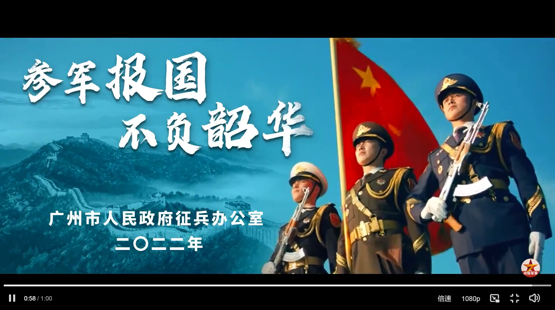 醒狮、南拳、粤韵悠扬……2022年,广州市征兵宣传片超燃发布!满满都是非遗元素,一整个国潮范儿“我们能在这休闲地喝早茶,是因为有很多人在我们背后,拼了命替我们遮风挡雨。”有一种英雄叫“中国军人”!你也想加入吗?那就来报名参军吧!