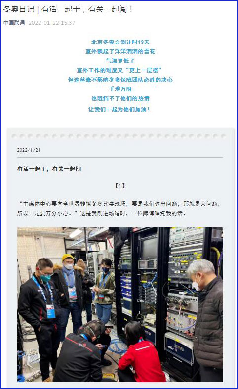 中工网讯 近日,北京飘雪。室外工作的难度又“更上一层楼”,但这丝毫不影响冬奥保障团队必胜的决心,千难万阻也阻挡不了他们的热情。1月22日,“中国联通”微信公众号报道了多位冬奥保障团队员工的工作生活,他们有活一起干,有关一起闯,为冬奥的顺利召开努力拼搏。一起来看↓