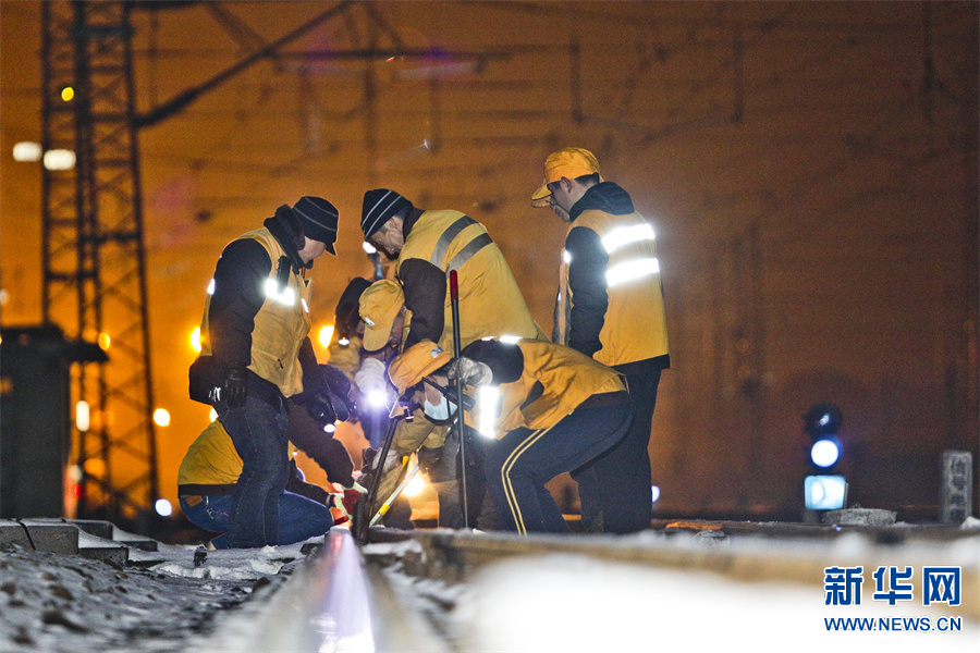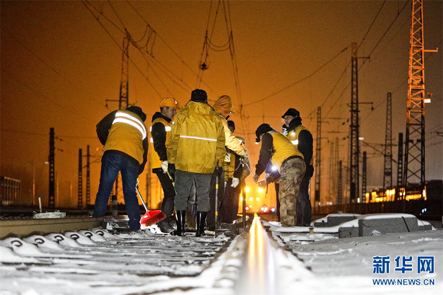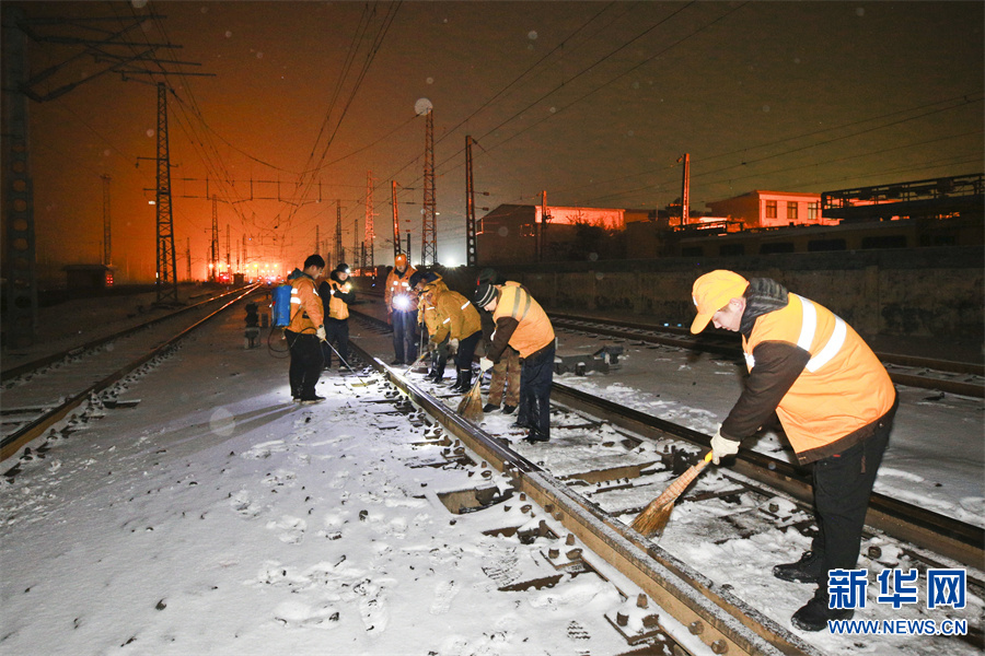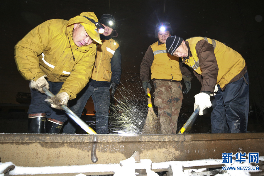 连日来,豫西南迎来较大降雪,焦柳、宁西线的轨道出现积雪。为确保春运线路安全畅通,中国铁路郑州局集团有限公司南阳工务段迅速启动应急预案。党员干部职工闻雪而动,利用临时天窗口,进行打冰除雪作业,确保管内线路设备无积雪、无结冰,确保铁路春运安全有序。新华网发(张中海 摄)