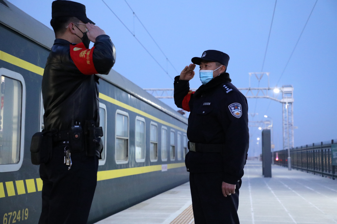 图为民警李志强与列车乘警交接工作完毕后敬礼道别。 武陇慧 摄
