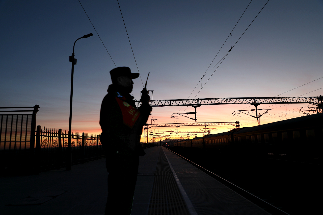 图为清晨民警李志强在站台使用对讲机与乘警对接工作。 武陇慧 摄
