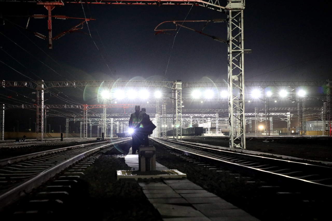 图为民警李志强与铁路派出所同事一起巡视股道。武陇慧 摄