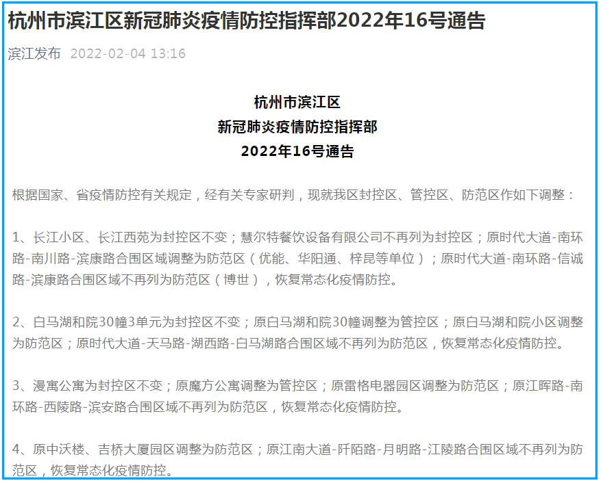 中工网讯 据“滨江发布”微信公众号消息,2月4日,杭州市滨江区新冠肺炎疫情防控指挥部发布2022年16号通告。通告称,根据国家、省疫情防控有关规定,经有关专家研判,现就滨江区封控区、管控区、防范区作如下调整:
