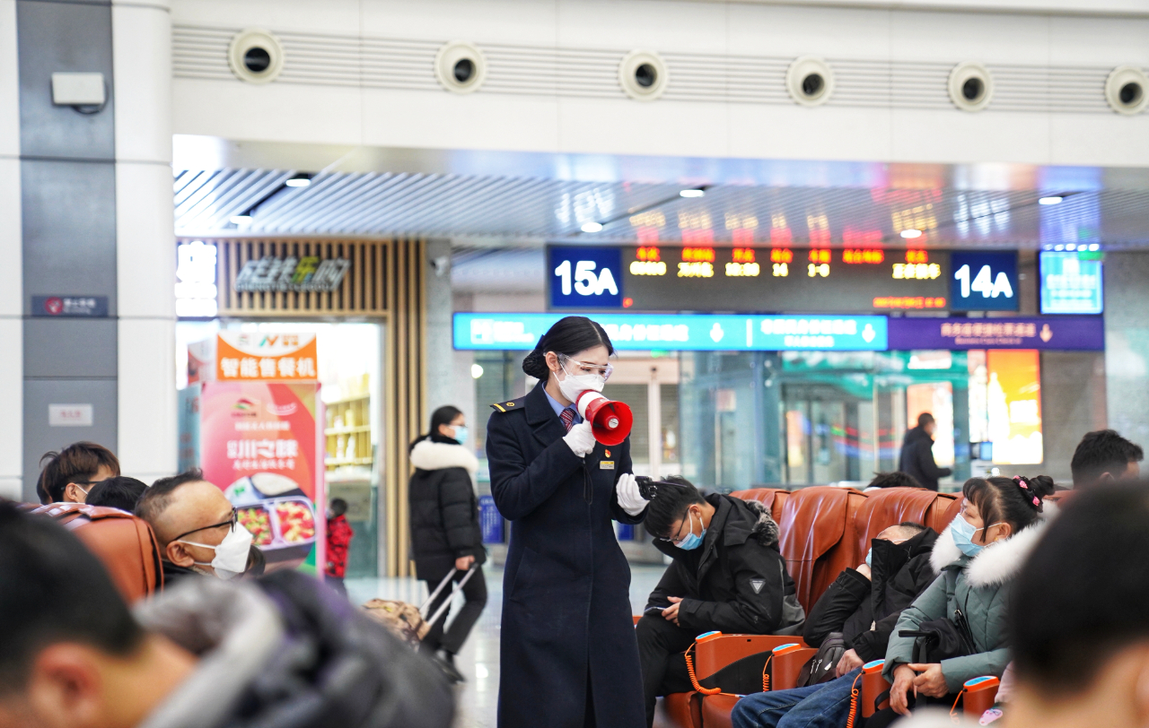 图为候车厅里,唐铮铮正通过小喇叭向旅客做防疫宣传 雷雪伊摄