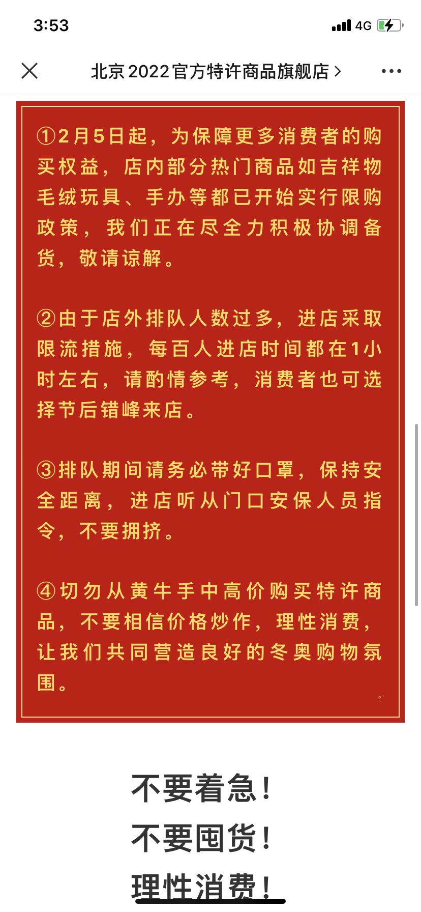 此外,北京2022官方特许商品旗舰店公众号5日也发布信息,表示冬奥旗舰店单日销售额在4号已经突破新高,达到近300万元,并提示消费者错峰来店,保持安全距离,不要囤货,理性购买。