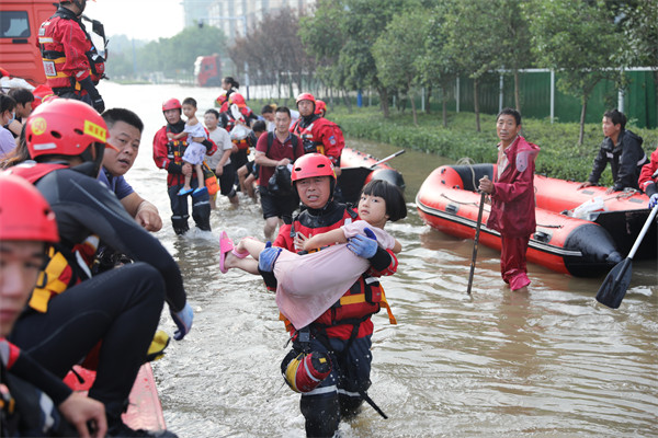 2021年7月,河南遭遇特大暴雨,洪涝围城,水淹村庄,全国各方力量火速驰援。北京市密云区消防救援支队消防指战员在卫辉市妇幼保健院附近转移被困群众。