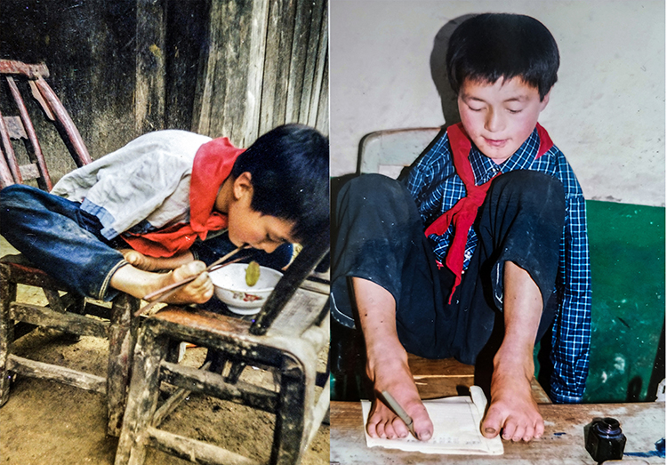 陈兹方小时候用脚训练吃饭写字的情景(资料照片)。