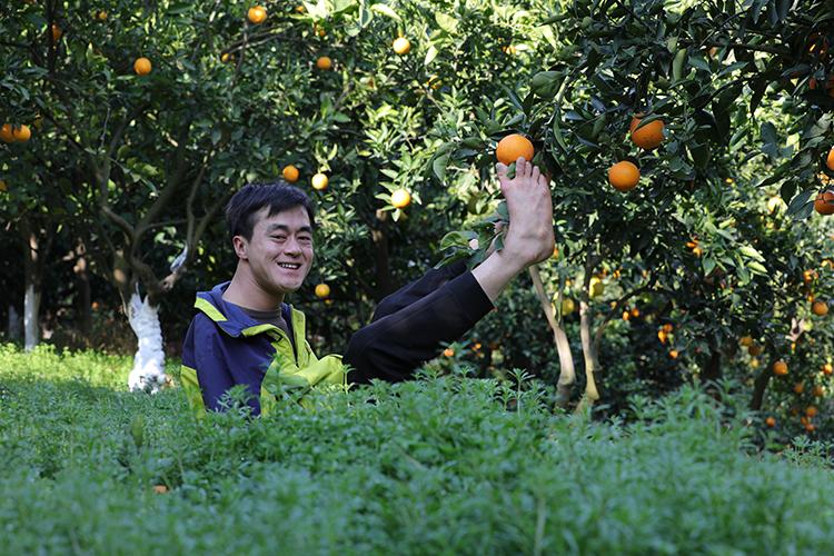 2021年2月5日,陈兹方在巴东长江巫峡岸边雷家坪村采摘橙子。