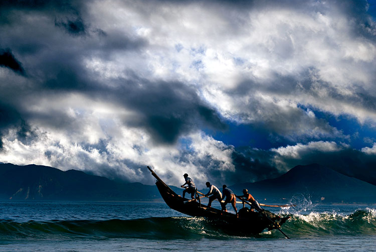 作品《闯海》是作者在东山时看到渔民们不畏海洋瞬息变化的天气勇往直前,表达了劳动人员不畏艰难,敢于与自然斗争,敢闯敢拼的劳动精神。