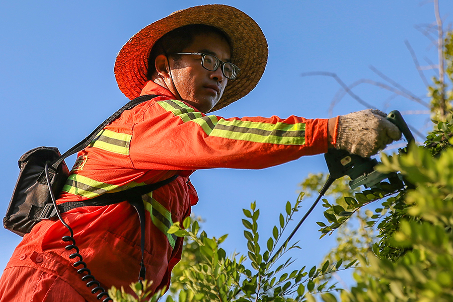 8月15日清晨,太湖街道中央大道,园林养护工人顶着烈日修剪技叶,汗水湿透了衣背。