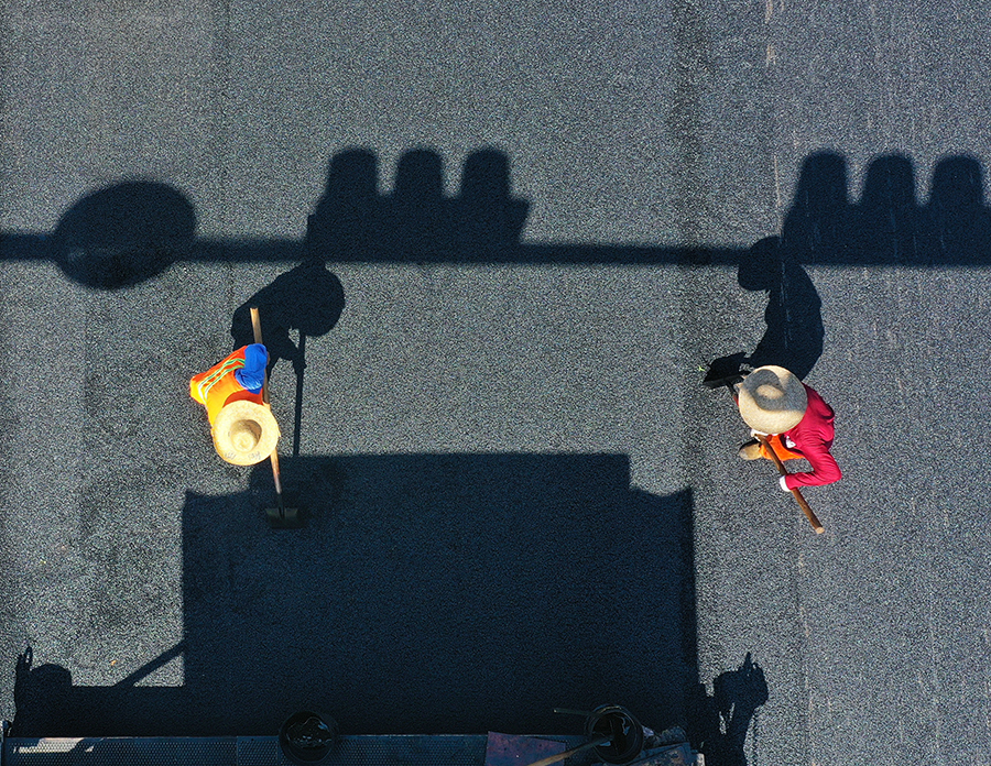 8月15日上午,318国道吕山段,公路养护人员冒高温铺设沥青,保障道路安全。