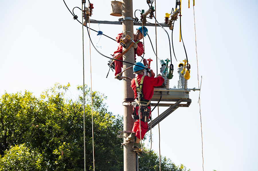 8月18日上午,李家巷镇李家巷村,供电工人在电杆上挥汗作业,确保民生安全用电。