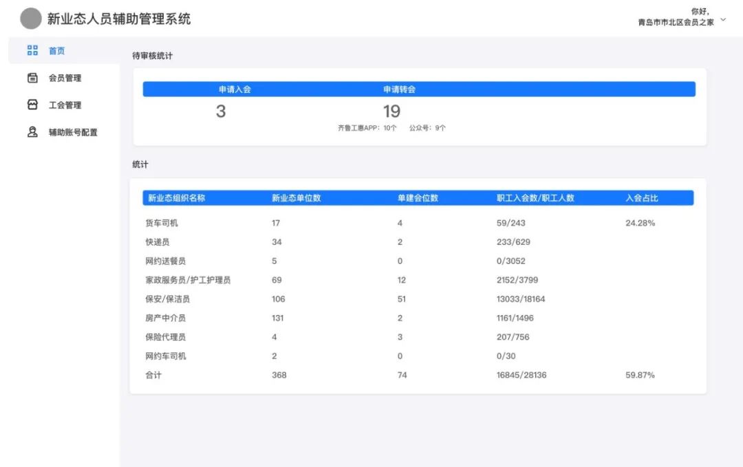 新就业形态劳动者建会入会工作与网上工会工作紧密结合,保障数据基础、数据安全及动态管理。申请入会和审批审核功能,可以同时在PC端和移动端上进行。入会申请审批流程实现智能化,拥有自动填充、自动选择等功能,便捷高效。界面美观大方,用户交互自然,只需简单点击就能跳转到需要的界面。