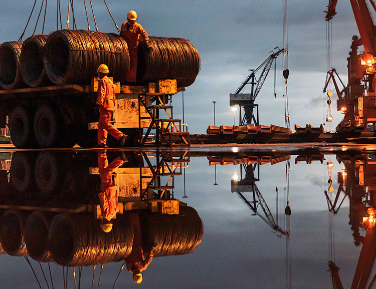 雨后,在美丽的夜色下,港口工人在作业线材。