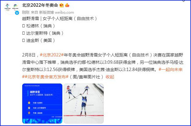 中工网讯 据北京2022年冬奥会和冬残奥会组织委员会官方微博消息,2月8日,北京2022年冬奥会越野滑雪女子个人短距离(自由技术)决赛在国家越野滑雪中心落下帷幕,瑞典选手约娜·松德林以3:09.68的成绩获得金牌,另一位瑞典选手马娅·达尔奎斯特以3:12.56的成绩获得银牌,美国选手杰茜·迪金斯以3:12.84的成绩获得铜牌。