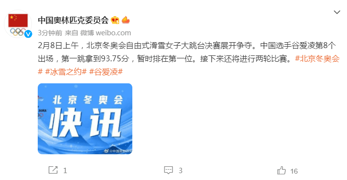 中工网讯 据中国奥林匹克委员会官方微博消息,2月8日上午,北京冬奥会自由式滑雪女子大跳台决赛展开争夺。中国选手谷爱凌第8个出场,第一跳拿到93.75分。接下来还将进行两轮比赛。