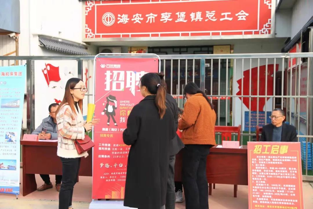 为保证企业春节后正常复工复产,海安市李堡镇总工会联合人社局在镇总工会门前,开展了企业专场招聘活动,成功签订用工合同18份,达成用工意向100多人。镇总工会积极向政府建言献策,李堡政府结合实际推出了2022年稳就业保用工政策十余条,助力企业“开门红”。镇总工会负责人表示:从现在起,全镇全面开启“招工即招生、入企即入校、企校双师联合培养”的企业新型学徒制培养新模式。由工会牵头,在全镇开展“千名职工大培训” 活动,学徒达到中级工、高级工、技师水平的,每人每年将分别获得4000元、6000元、8000元补贴。