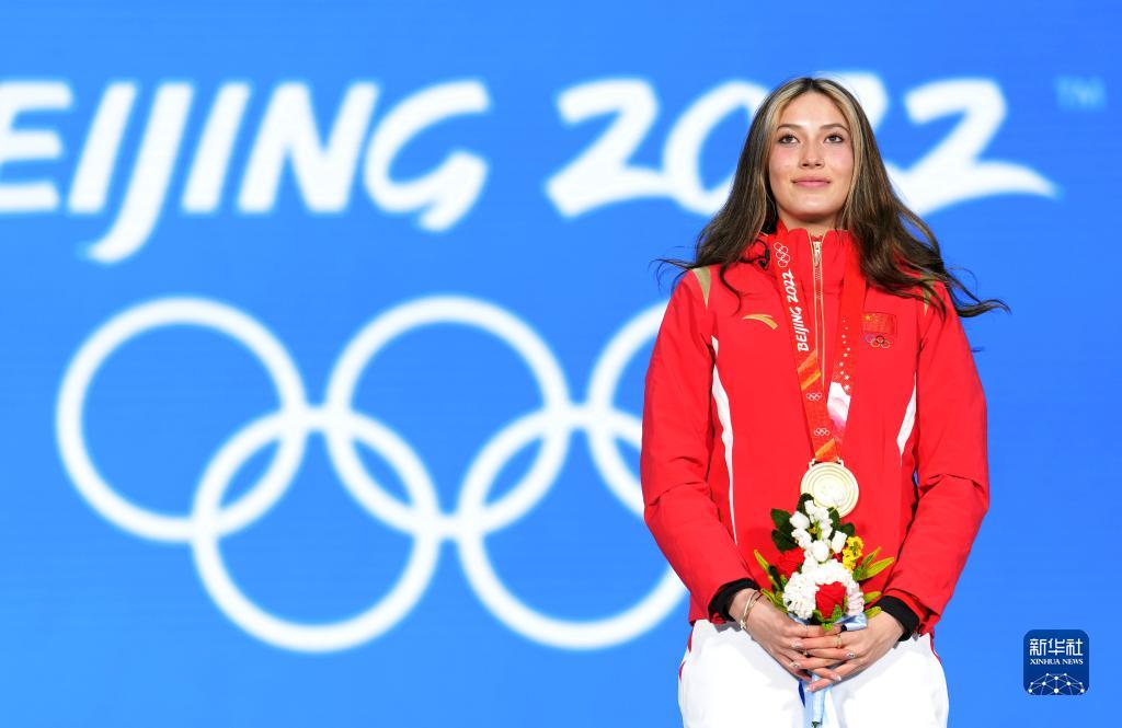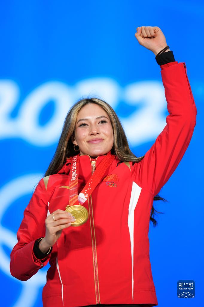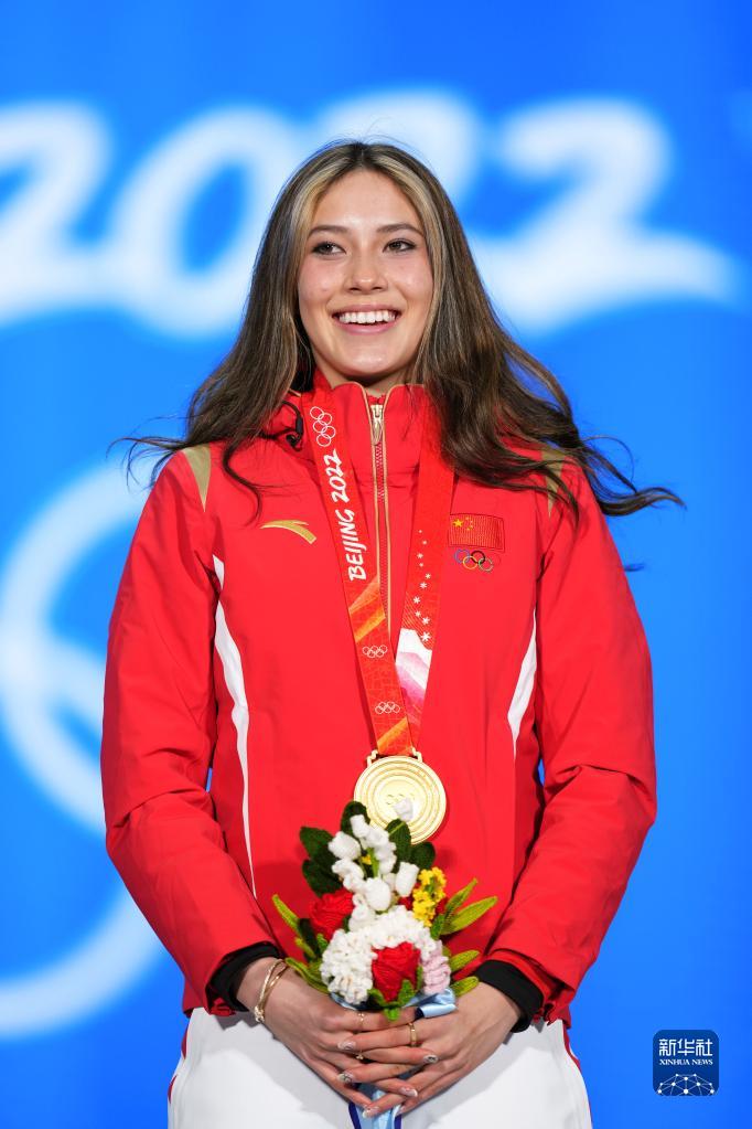 2月8日,冠军中国队选手谷爱凌在奖牌颁发仪式上。