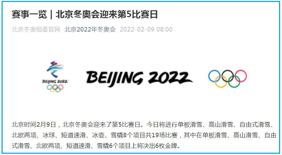 中工网讯 据北京2022年冬奥会微信公众号消息,北京时间2月9日,北京冬奥会迎来了第5比赛日。今日将进行单板滑雪、高山滑雪、自由式滑雪、北欧两项、冰球、短道速滑、冰壶、雪橇8个项目共19场比赛,其中在单板滑雪、高山滑雪、自由式滑雪、北欧两项、短道速滑、雪橇6个项目上将决出6枚金牌。