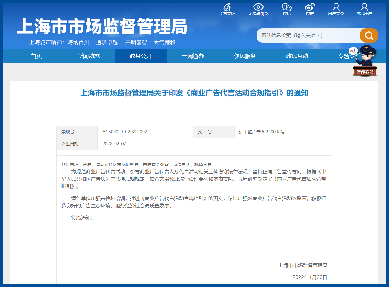中工网讯 据上海市市场监管局网站消息,近日,为规范商业广告代言活动,引导商业广告代言人及代言活动相关主体遵守法律法规,坚持正确广告宣传导向,根据《中华人民共和国广告法》等法律法规规定,结合文娱领域综合治理要求和本市实际,上海市市场监管局研究制定并发布《商业广告代言活动合规指引》。全文如下:
