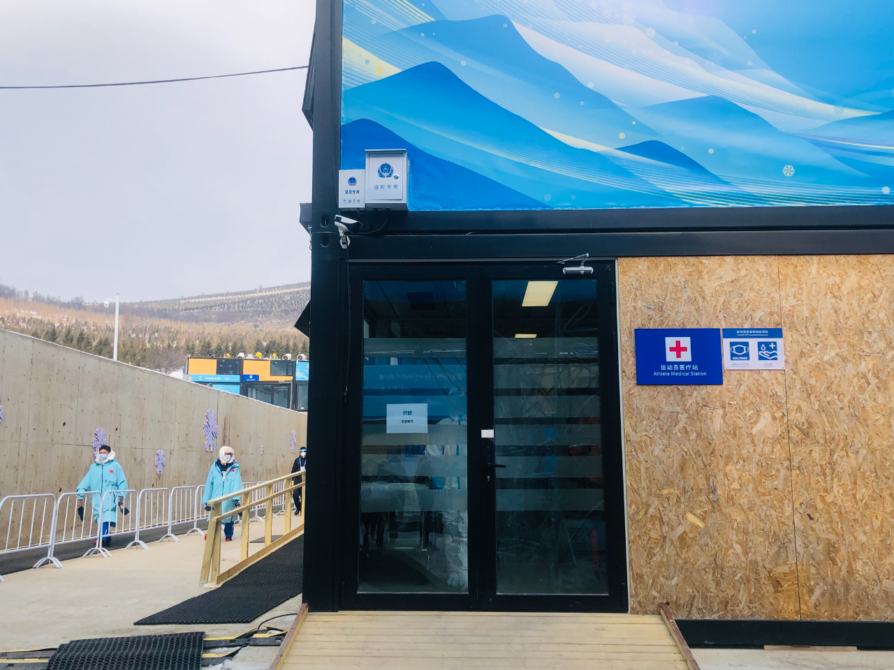 虽然经过了清理,但雪道阶梯上依然还有冰雪,再加上张家口连日低温,阶梯又有一些坡度,因此比较湿滑。上去的媒体记者们基本都是降低重心,缓慢通过。
