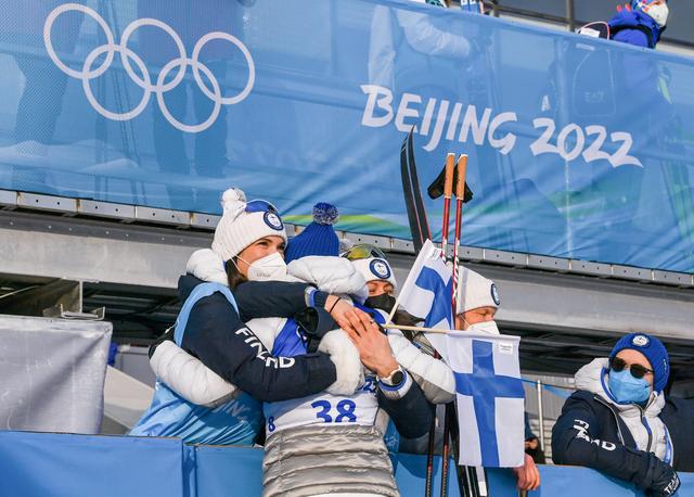 2月10日,芬兰选手克丽丝塔·帕尔马科斯基(左二)在比赛后与场边人员庆祝。 新华社记者 胡虎虎 摄