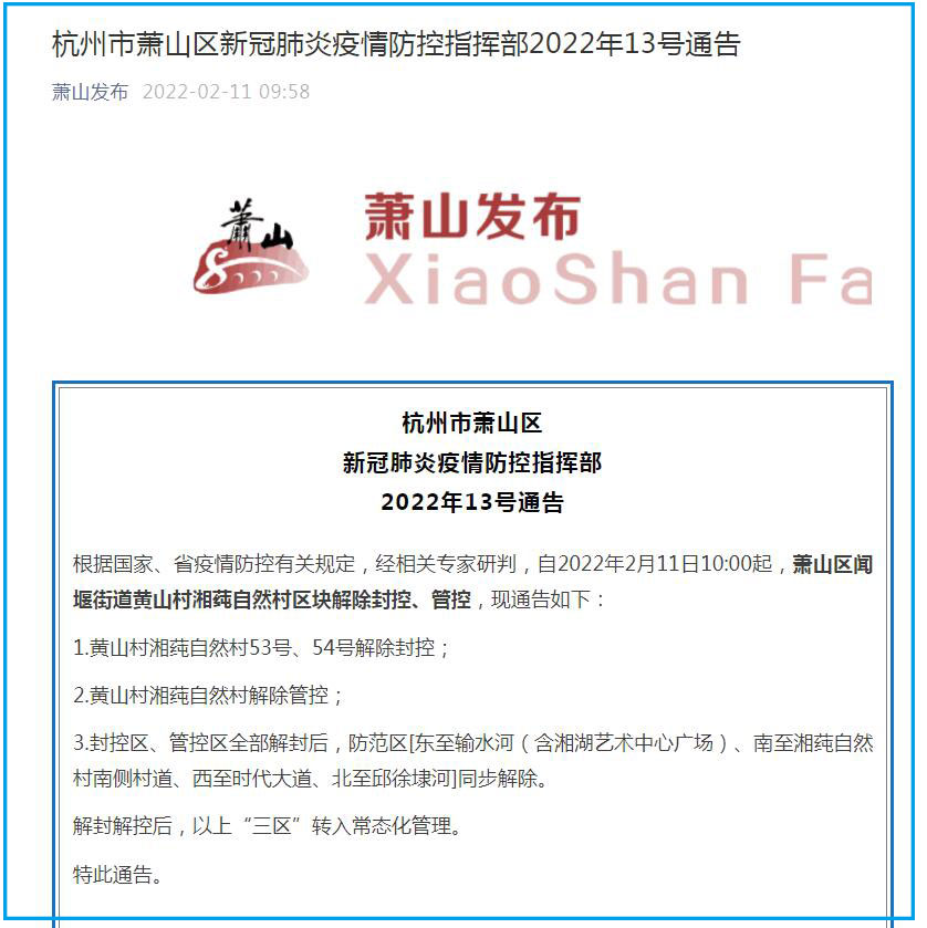 中工网讯 据“萧山发布”微信公众号消息,2月11日,杭州市萧山区新冠肺炎疫情防控指挥部2022年13号通告。通告称,根据国家、省疫情防控有关规定,经相关专家研判,自2022年2月11日10:00起,萧山区闻堰街道黄山村湘莼自然村区块解除封控、管控,通告如下: