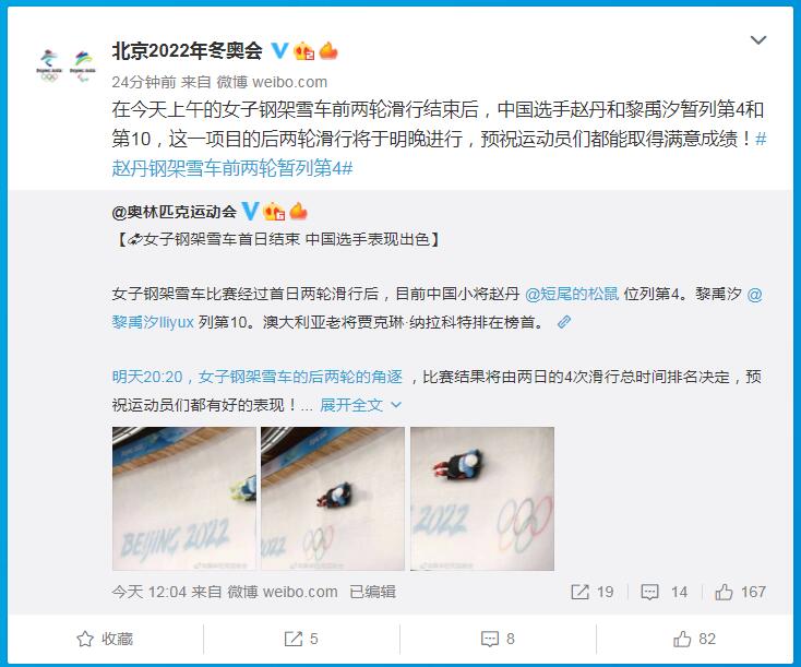 据北京2022年冬奥会官方微博消息,在今天(2月11日)上午的女子钢架雪车前两轮滑行结束后,中国选手赵丹和黎禹汐暂列第4和第10,这一项目的后两轮滑行将于明晚进行,预祝运动员们都能取得满意成绩。