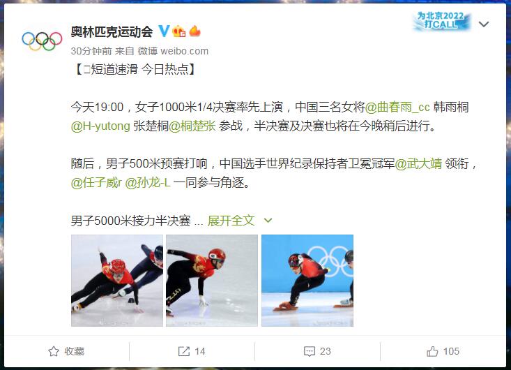 据奥林匹克运动会官方微博消息,今天(2月11日)19:00,北京2022年冬奥会女子1000米1/4决赛率先上演,中国三名女将@曲春雨_cc 韩雨桐@H-yutong 张楚桐@桐楚张参战,半决赛及决赛也将在今晚稍后进行。