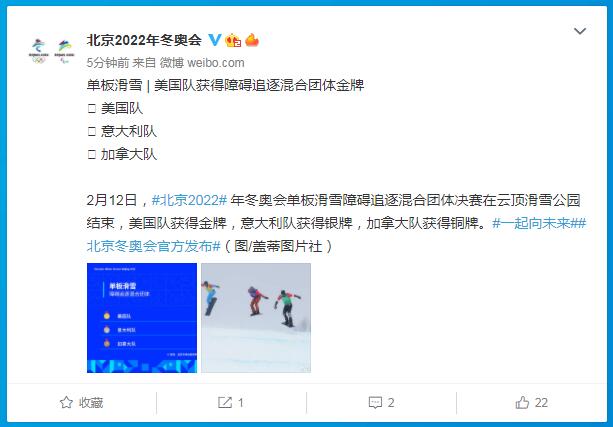 中工网讯 据北京2022年冬奥会和冬残奥会组织委员会官方微博消息,2月12日,北京2022年冬奥会单板滑雪障碍追逐混合团体决赛在云顶滑雪公园结束,美国队获得金牌,意大利队获得银牌,加拿大队获得铜牌。