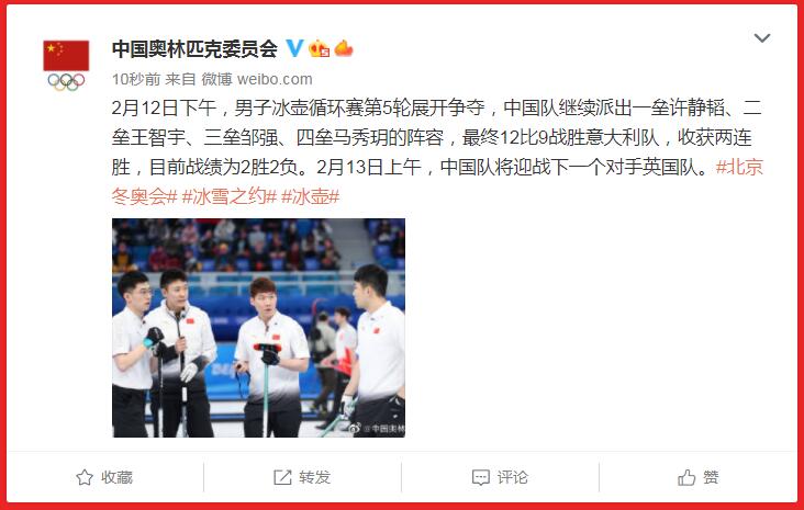 据中国奥林匹克委员会官方微博消息,2月12日下午,男子冰壶循环赛第5轮展开争夺,中国队继续派出一垒许静韬、二垒王智宇、三垒邹强、四垒马秀玥的阵容,最终12比9战胜意大利队,收获两连胜,目前战绩为2胜2负。2月13日上午,中国队将迎战下一个对手英国队。