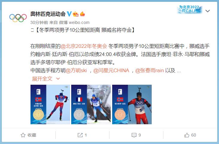 据奥林匹克运动会官方微博消息,在刚刚结束的北京2022年冬奥会冬季两项男子10公里短距离比赛中,挪威选手约翰内斯·廷内斯·伯厄以总成绩24:00.4收获金牌。法国选手康坦·菲永·马耶和挪威选手多塔尔耶伊·伯厄分获亚军和季军。