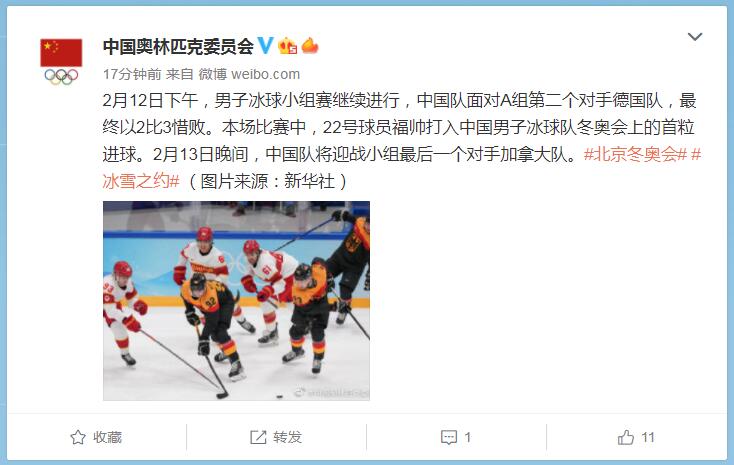 据中国奥林匹克委员会官方微博消息,2月12日下午,男子冰球小组赛继续进行,中国队面对A组第二个对手德国队,最终以2比3惜败。本场比赛中,22号球员福帅打入中国男子冰球队冬奥会上的首粒进球。2月13日晚间,中国队将迎战小组最后一个对手加拿大队。