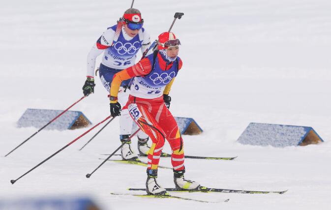 2月13日,中国选手唐佳琳(右)在比赛中。当日,在国家冬季两项中心举行的北京2022年冬奥会冬季两项女子10公里追逐比赛中,挪威选手马特·奥尔斯布·雷塞兰获得冠军。新华社记者 丁汀 摄