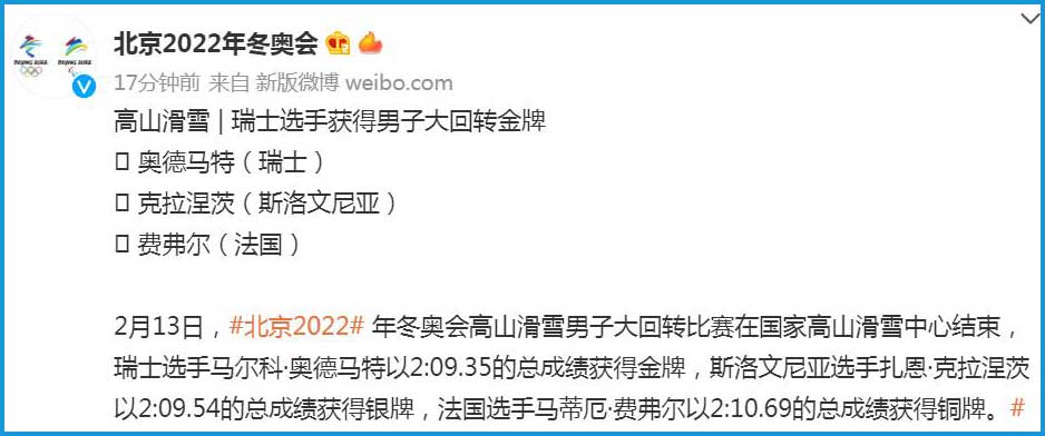 据北京2022年冬奥会官方微博消息,2月13日,北京2022年冬奥会高山滑雪男子大回转比赛在国家高山滑雪中心结束,瑞士选手马尔科·奥德马特以2:09.35的总成绩获得金牌,斯洛文尼亚选手扎恩·克拉涅茨以2:09.54的总成绩获得银牌,法国选手马蒂厄·费弗尔以2:10.69的总成绩获得铜牌。