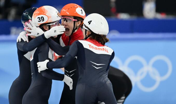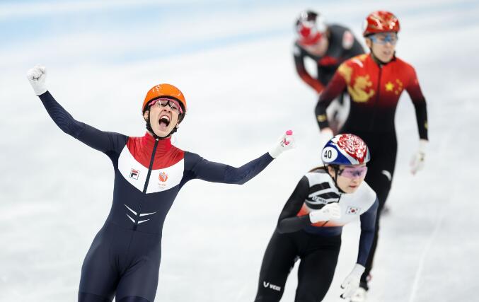2月13日,荷兰队选手苏珊娜·舒尔廷(左一)在比赛后庆祝。当日,北京2022年冬奥会短道速滑项目女子3000米接力决赛在首都体育馆举行,荷兰队获得冠军。新华社记者 兰红光 摄