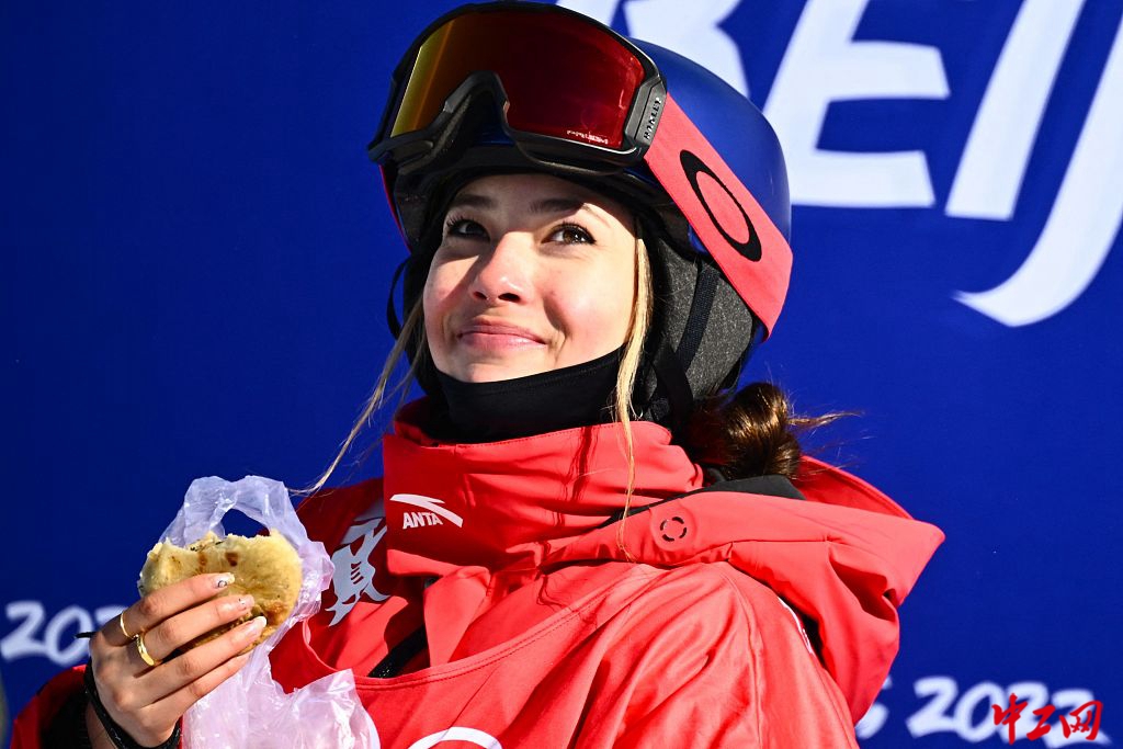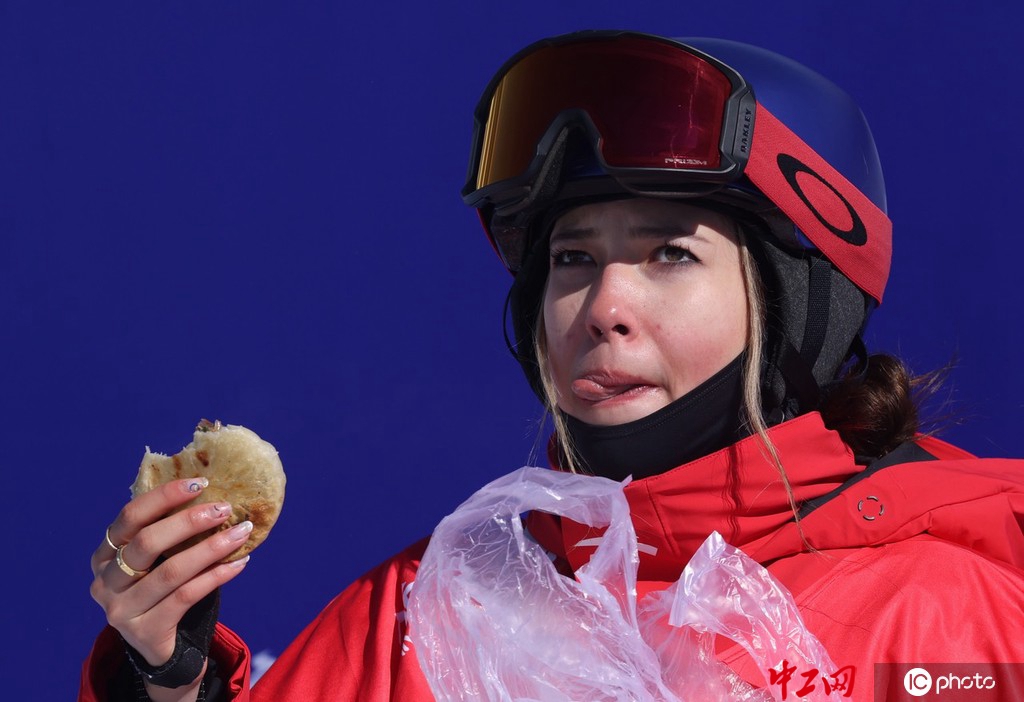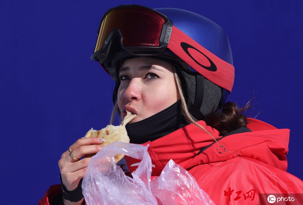 北京冬奥会自由式滑雪女子坡面障碍技巧资格赛。谷爱凌在等分区吃韭菜盒子。图片来源:东方IC