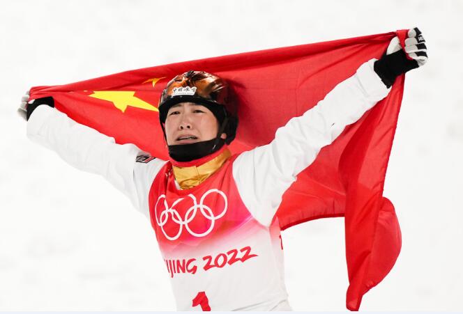 2月14日,中国选手徐梦桃在比赛后庆祝。当日,北京2022年冬奥会自由式滑雪女子空中技巧决赛在张家口云顶滑雪公园举行,中国选手徐梦桃夺得冠军。新华社记者 薛玉斌 摄