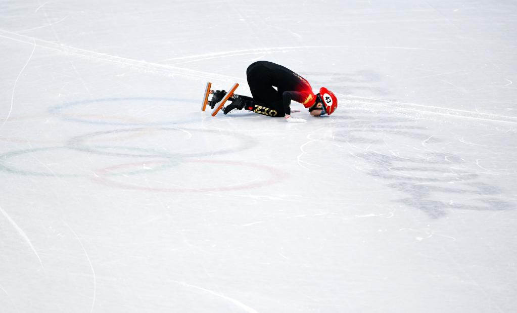 2月13日,中国队选手范可新在北京冬奥会短道速滑女子3000米接力赛后亲吻冰面。新华社记者李一博摄
